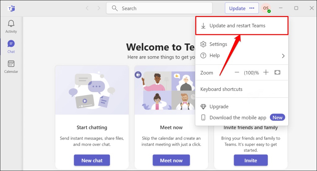 2.Van dedrie puntjes (…)menu, kies deUpdate en start Teams opnieuwoptie om de lopende update te installeren. Als u geen knop ziet, betekent dit dat er geen updates hoeven te worden geïnstalleerd.