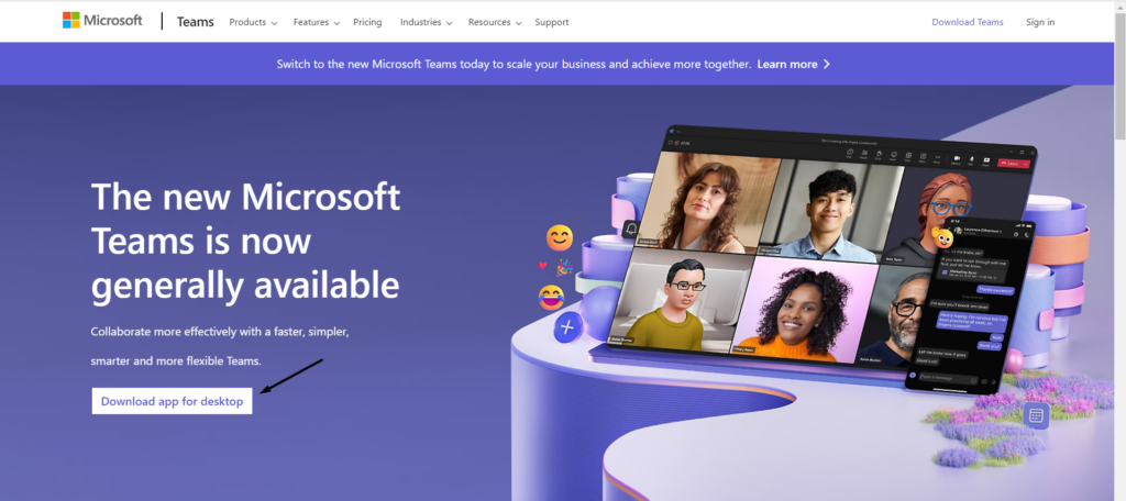 3.Zodra de Microsoft Teams-app van uw pc is verwijderd, klikt u ophierom naar de downloadpagina van Teams te gaan. Op de volgende webpagina kiest u deDownload-app voor desktopom zijn bestand te verkrijgen.