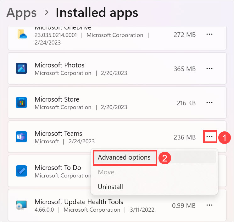 3.Klik op dedrie puntjes (…)ernaast en kiesGeavanceerde optiesuit het vervolgkeuzemenu.