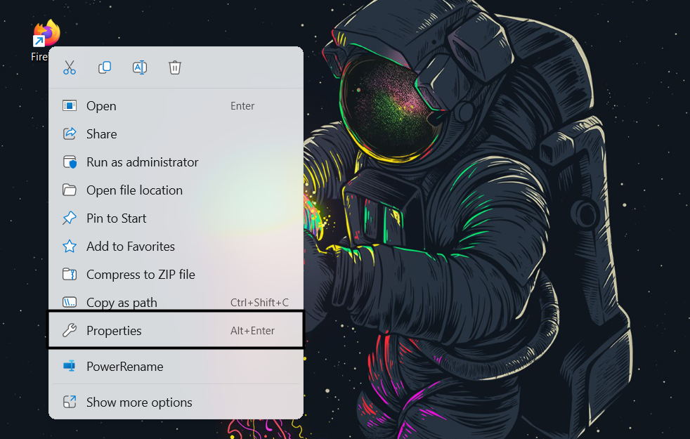 1.Om de probleemoplosser voor programmacompatibiliteit in Windows 11 uit te voeren, klikt u met de rechtermuisknop op hetFirefoxsnelkoppeling.