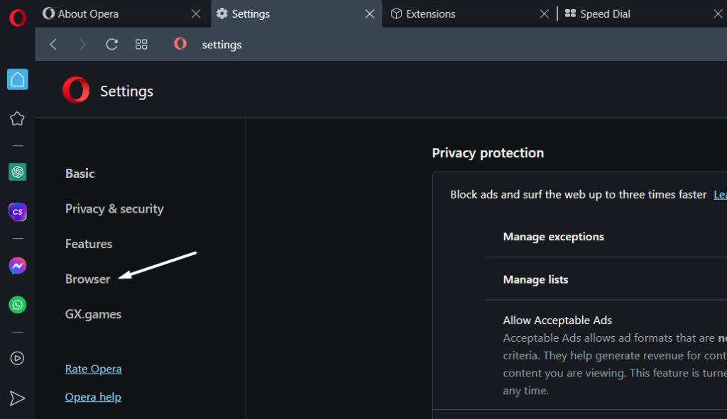 2.Selecteer deInstellingenoptie uit het vervolgkeuzemenu en selecteer vervolgensBrowservanaf links.