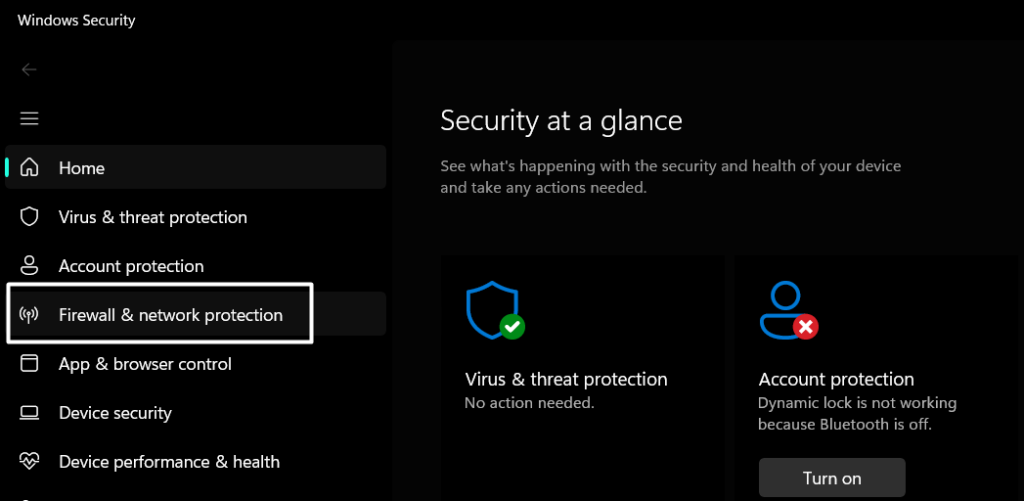 1.Open deWindows-beveiligingapp op uw systeem en klik opFirewall- en netwerkbeveiligingaan de linkerkant.