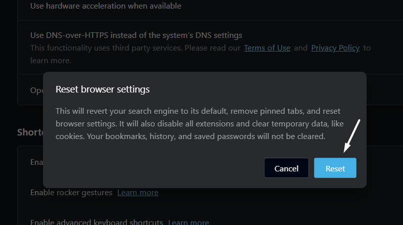 4.Klik op deOpnieuw instellenknop in deBrowserinstellingen opnieuw instellengevraagd om alle instellingen terug te zetten naar de standaardinstellingen.