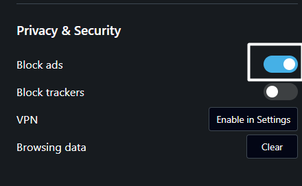 2.Ga vanuit het vervolgkeuzemenu naar dePrivacy en veiligheidsectie en zoek naarBlokkeer advertenties.