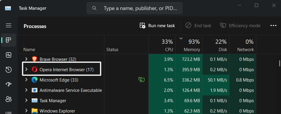 2.Zoek naar deOpera internetbrowserproces in deProcessentabblad en klik er met de rechtermuisknop op.