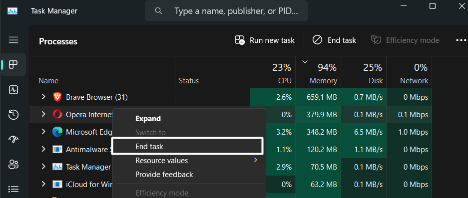 3.SelecteerEinde taakvanuit het contextmenu om de actieve Opera-app geforceerd te beëindigen.