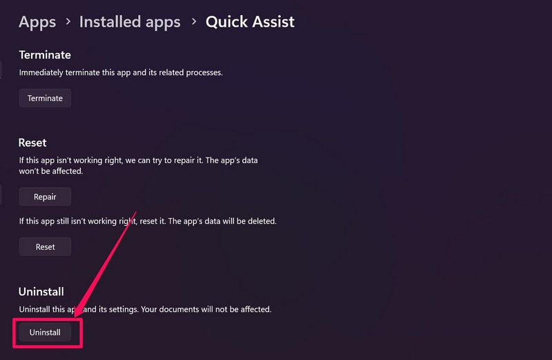 Volg onderstaande stappen om de Quick Assist-app in Windows 11 te repareren: