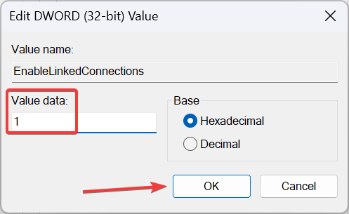 Stap 5:Kies DWORD (32bit)-waarde en er wordt een nieuw item gemaakt. Hernoem dit item als EnableLinkedConnections.
