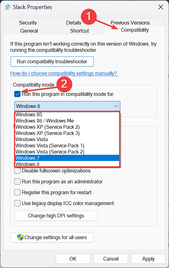 Stap 2:Navigeer naar het tabblad Compatibiliteit, selecteer een eerdere versie van het besturingssysteem in het vervolgkeuzemenu en vink het vakje aan voor 'Dit programma uitvoeren in compatibiliteitsmodus'.