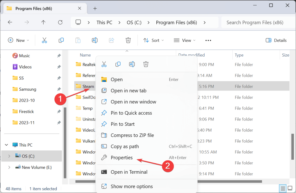 Stap 1:Kies Eigenschappen in het contextmenu wanneer u met de rechtermuisknop klikt op de map die het getroffen programma bevat.
