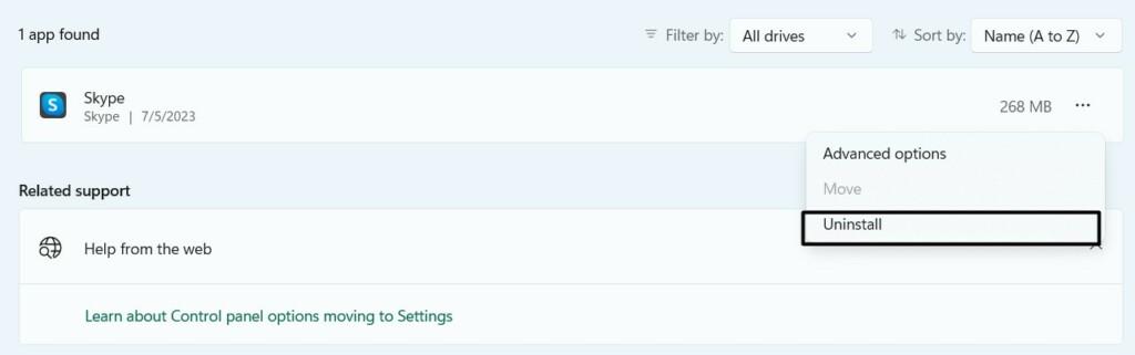 2.Klik op dedrie puntjes (…)naast Skype en selecteer deVerwijderenoptie uit het vervolgkeuzemenu.