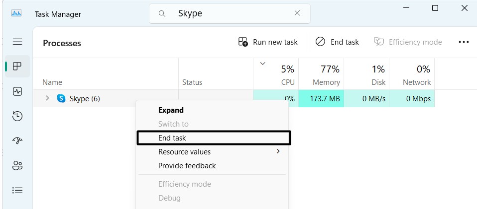 2.Zoeken naarSkypenonder deProcessensectie en klik er met de rechtermuisknop op om het contextmenu te openen.