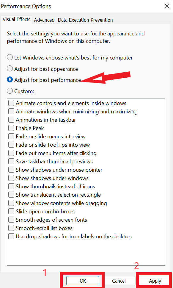 - Kies nu op het tabblad Visuele effecten de optiePas aan voor de beste prestaties.