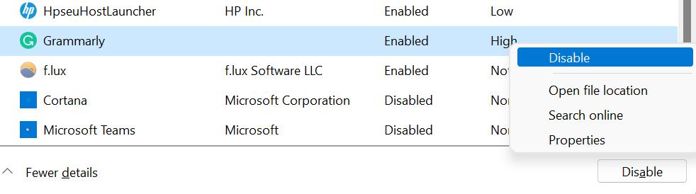 - Doorloop de lijst en selecteer de app met de hoge opstartimpact op de pc enklik met de rechtermuisknoperop. Kies nuUitzetten.
