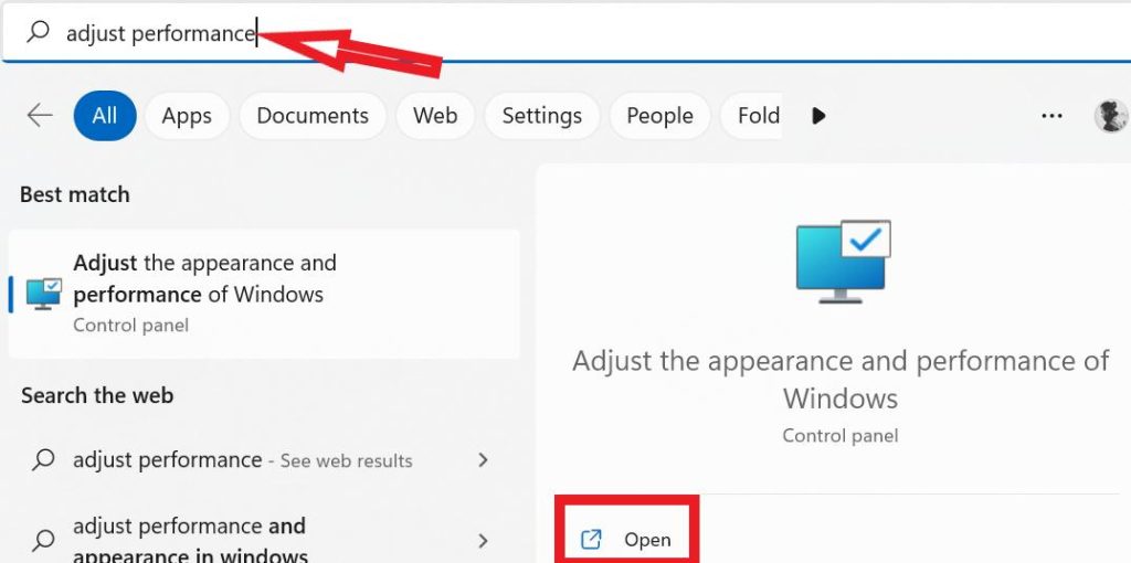 - Klik op het zoekpictogram en typprestaties aanpassenen open de allereerste suggestie.