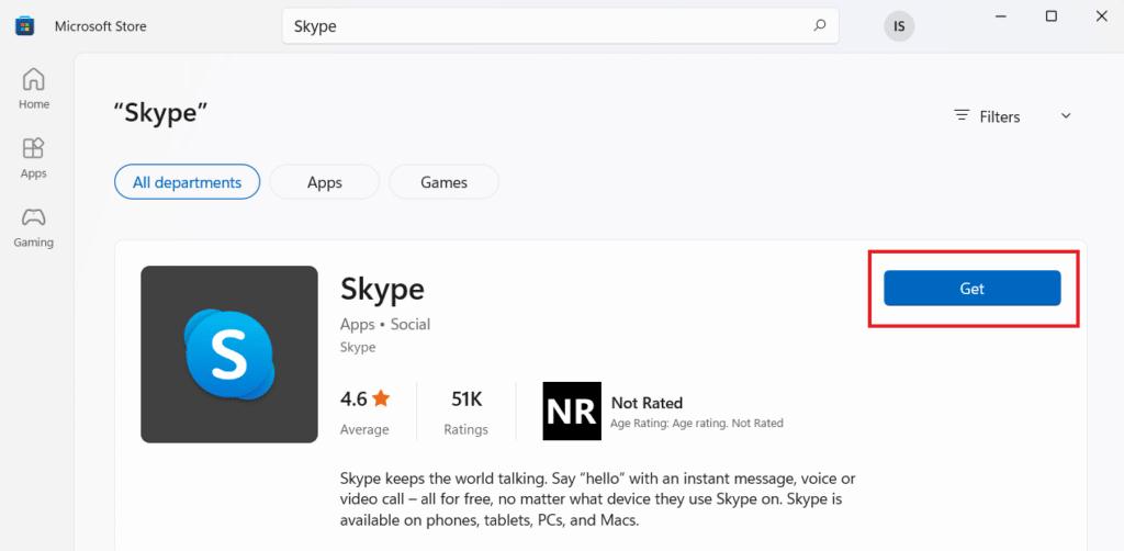 - Om Skype opnieuw te installeren, typt uSkypenin de zoekbalk en selecteerKrijgen.
