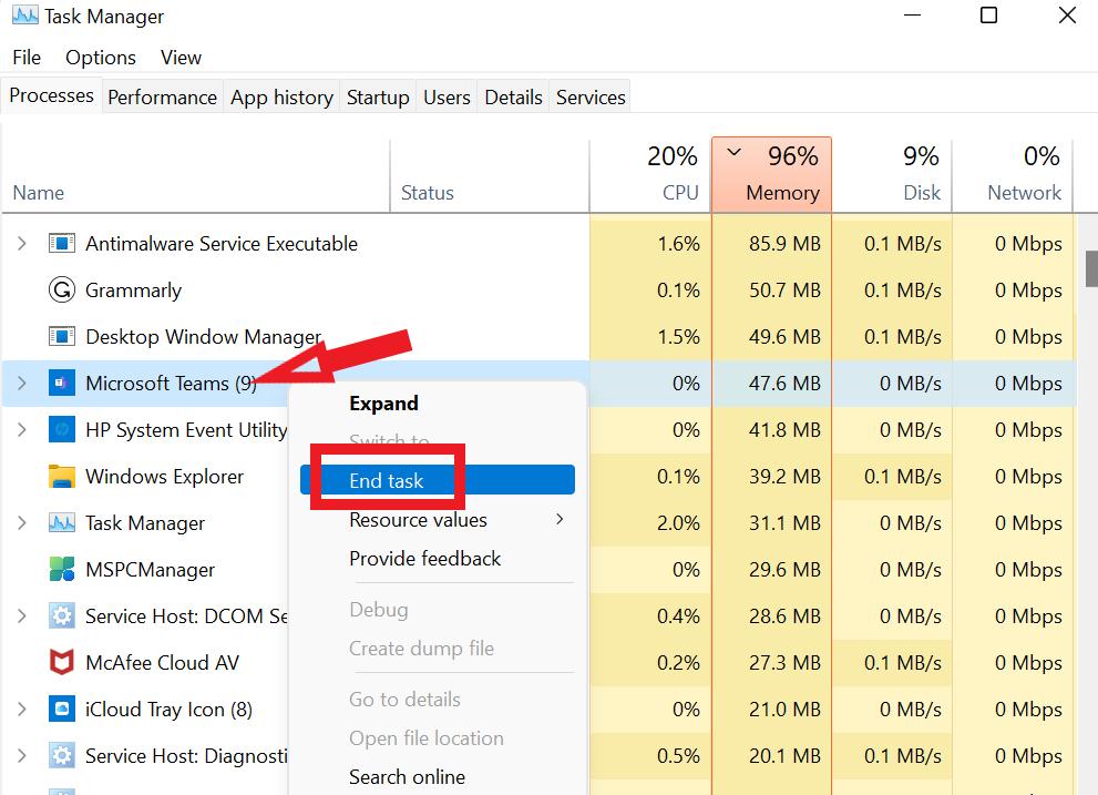 - Klik met de rechtermuisknopop de app/het proces dat u wilt beëindigen en kiesBeëindig de taak.
