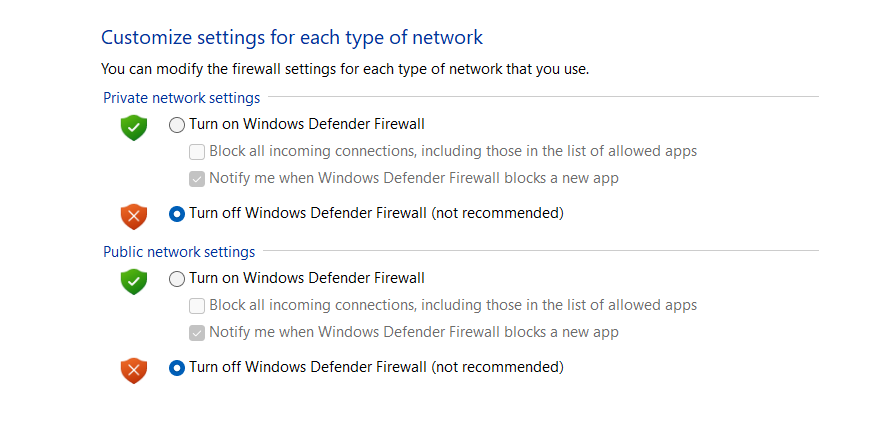 3.Stel nu beide inInstellingen voor privénetwerkenEnOpenbare netwerkinstellingennaarSchakel Windows Defender Firewall uit (niet aanbevolen)om de Windows Firewall uit te schakelen.