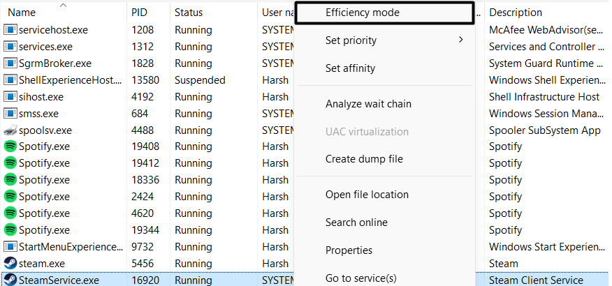 2.Zoek vervolgens naar deSteamService.exetaak in deDetailssectie,klik met de rechtermuisknoperop en zorg ervoor dat er geen vinkje naast staatEfficiëntiemodusoptie. Als er een vinkje staat, betekent dit dat dit zo isingeschakeld. U moet op klikkenEfficiëntiemodusoptie omuitzettenHet.