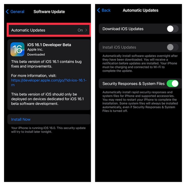 - Schakel nu de schakelaars uit voor het downloaden en installeren van iOS-updates.