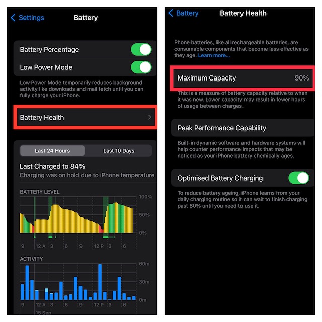 - Open de app Instellingen op uw iPhone -> Batterij -> Batterijstatus. Controleer nu de maximale capaciteit van de batterij. Als het onder de 80% is gedaald, kan de versleten batterij heel goed de oorzaak zijn.