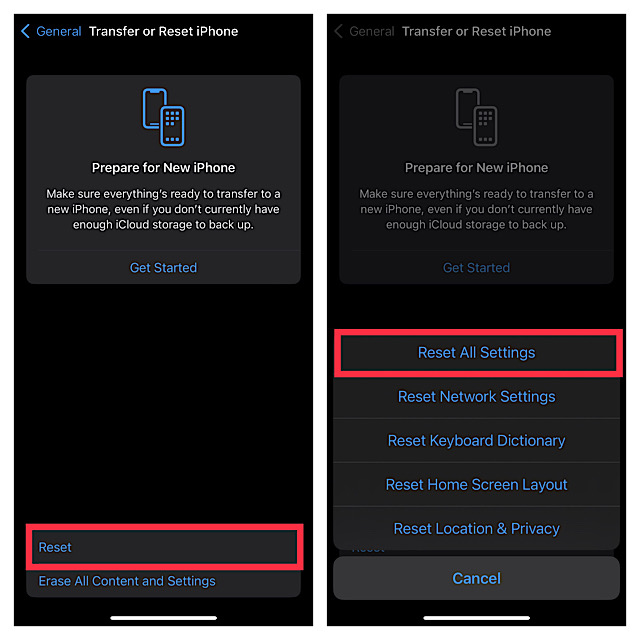 - Open de app Instellingen op uw iPhone -> Algemeen -> iPhone overbrengen of resetten -> Alle instellingen resetten. Voer vervolgens de toegangscode van uw apparaat in en bevestig de actie.