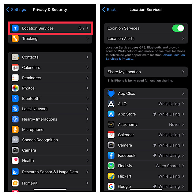 - Ga naar de app Instellingen -> Privacy en beveiliging -> Locatievoorzieningen en schakel deze vervolgens uit.