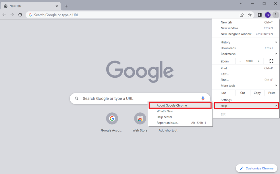 2.SelecteerHulpen klik vervolgens op deOver Google Chromeoptie voor het contextmenu.
