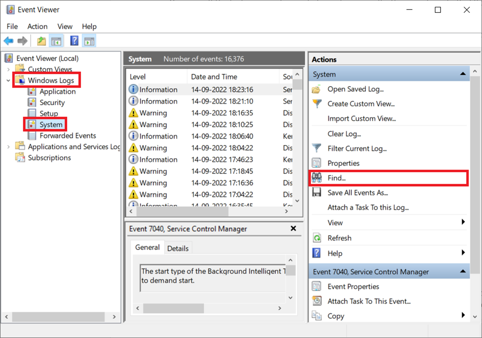 6.Op deGebeurtenisviewervenster, navigeer naar de volgende locatie en selecteerVindenin het rechterdeelvenster.