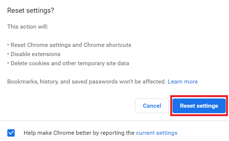 Het opnieuw instellen van de browser is een effectieve methode als u de fout met slechts één klik wilt oplossen. Wanneer u uw browser instelt, wordt doorgaans elke browserinstellingsoptie gewijzigd naar de standaardmodus.