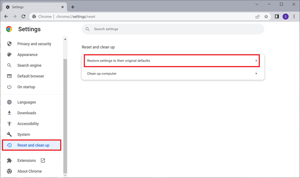 2.Op deChrome-instellingenpagina, scroll naar beneden in het linkerdeelvenster en selecteerResetten en opruimenoptie. Klik vervolgensHerstel de instellingen naar hun oorspronkelijke standaardwaardenaan de rechterkant.