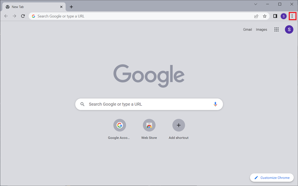 1.Klik op depictogram met drie verticale stippenaanwezig in de rechterbovenhoek van de Chrome-browserpagina.