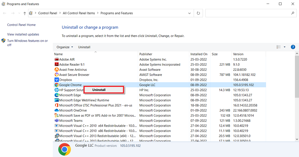 3.Zoek en klik met de rechtermuisknop op hetCanarische versie van Google Chromeen selecteerVerwijderen.