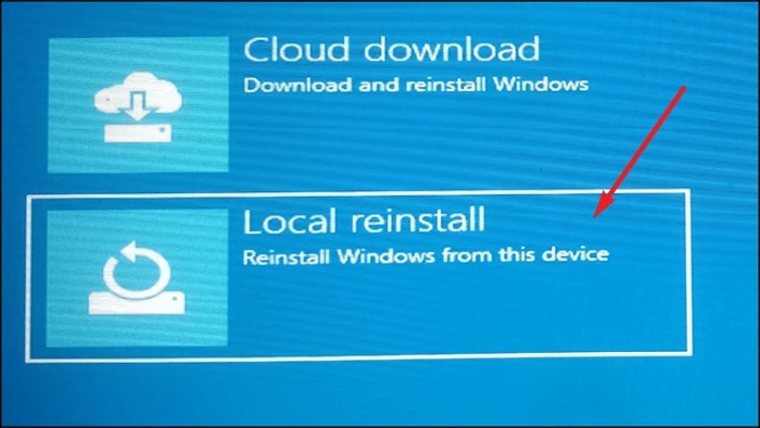 4.Kies deLokale herinstallatieoptie om Windows 11 opnieuw te installeren op uw pc zonder internet.