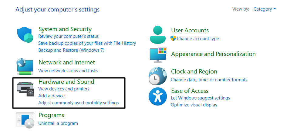 1.Lanceer deHulpprogramma Configuratieschermop uw pc en selecteer deHardware en Geluidoptie.