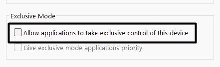 4.Haal het vinkje wegToestaan dat applicaties exclusieve controle over dit apparaat overnemenoptie in het venster.