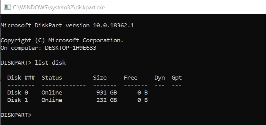 3. Typ list disk en druk op Enter. Hierdoor wordt een lijst weergegeven met schijven die op uw computer zijn aangesloten.