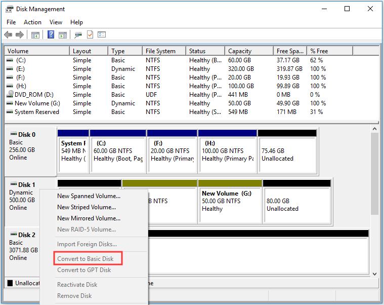 4. Nadat u alle volumes op de dynamische schijf hebt verwijderd, klikt u met de rechtermuisknop op de dynamische schijf zelf en selecteert u 'Converteren naar basisschijf'.