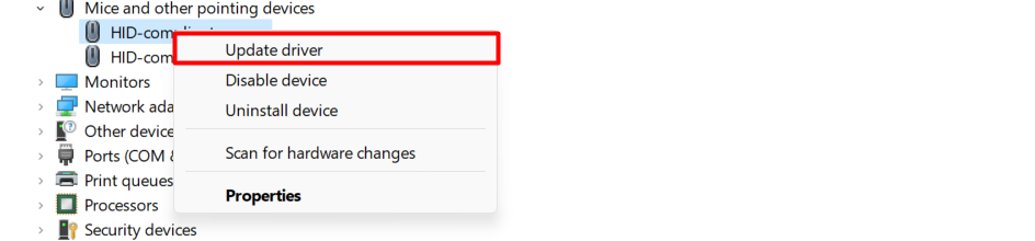 4. Selecteer een bestuurderin deVervolgkeuzemenu Muizen en andere aanwijsapparatenEnklik met de rechtermuisknoperop.