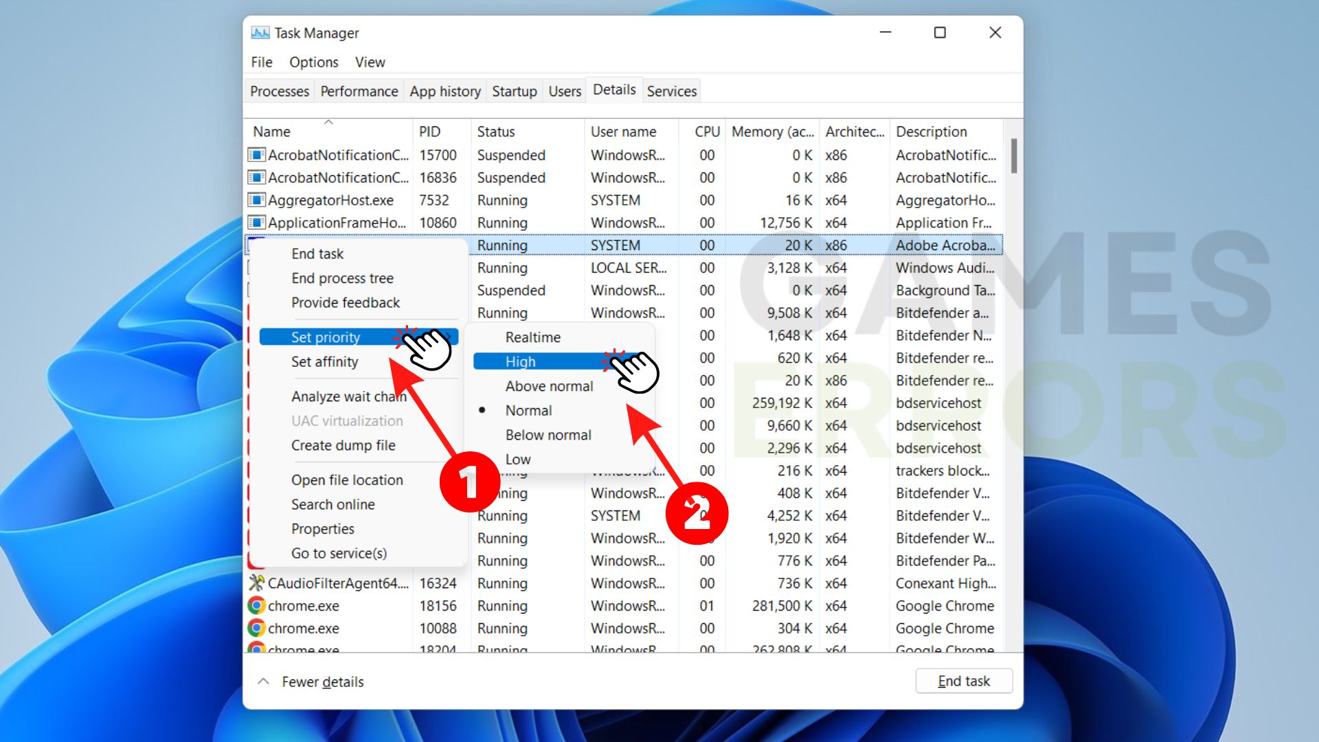 - Klik met de rechtermuisknopWow.exeBestand op de lijst, klik opStel prioriteit in,en selecterenHoog.