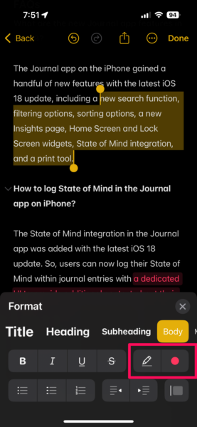 Nu is het markeren van tekstinhoud in notities in de Notes-app op de iPhone in iOS 18 vrij eenvoudig. Als je de rich-text-opmaakopties al gebruikt terwijl je aantekeningen maakt met de Notes-app op je iPhone, is het markeren van teksten voor jou een fluitje van een cent. U vindt de nieuwe markeeroptie in de opmaakmenubalk in de Notes-app nadat u uw iPhone hebt bijgewerkt naar de nieuwste iOS 18-versie.
