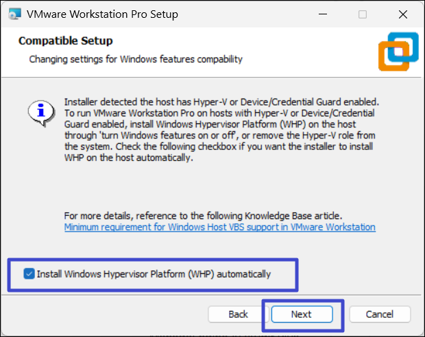 4. Selecteer desgevraagd de “Installeer Hypervisor Platform (WHP) automatisch”optie en klik op “Volgende“.