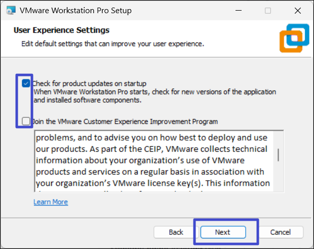 6. U kunt er ook voor kiezen om de “Controleer op productupdates bij het opstarten”En "Sluit u aan bij het VMware Customer Experience Improvement Program"opties. Klik vervolgens op "Volgende".