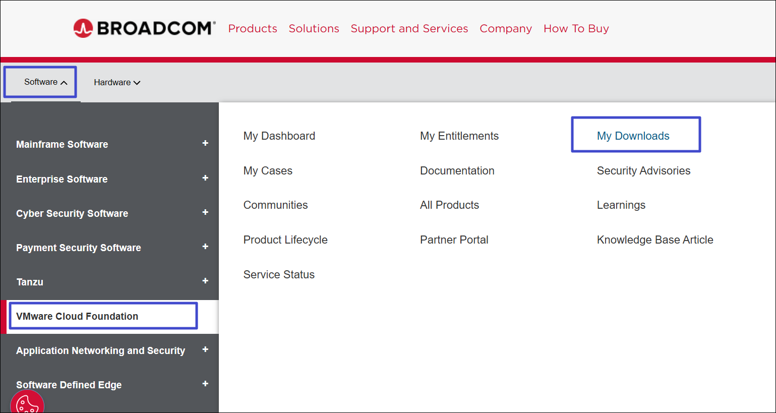 6. Open het “Software"-menu, klik“VMware Cloud Foundation”en klik op “Mijn downloads”aan de rechterkant.