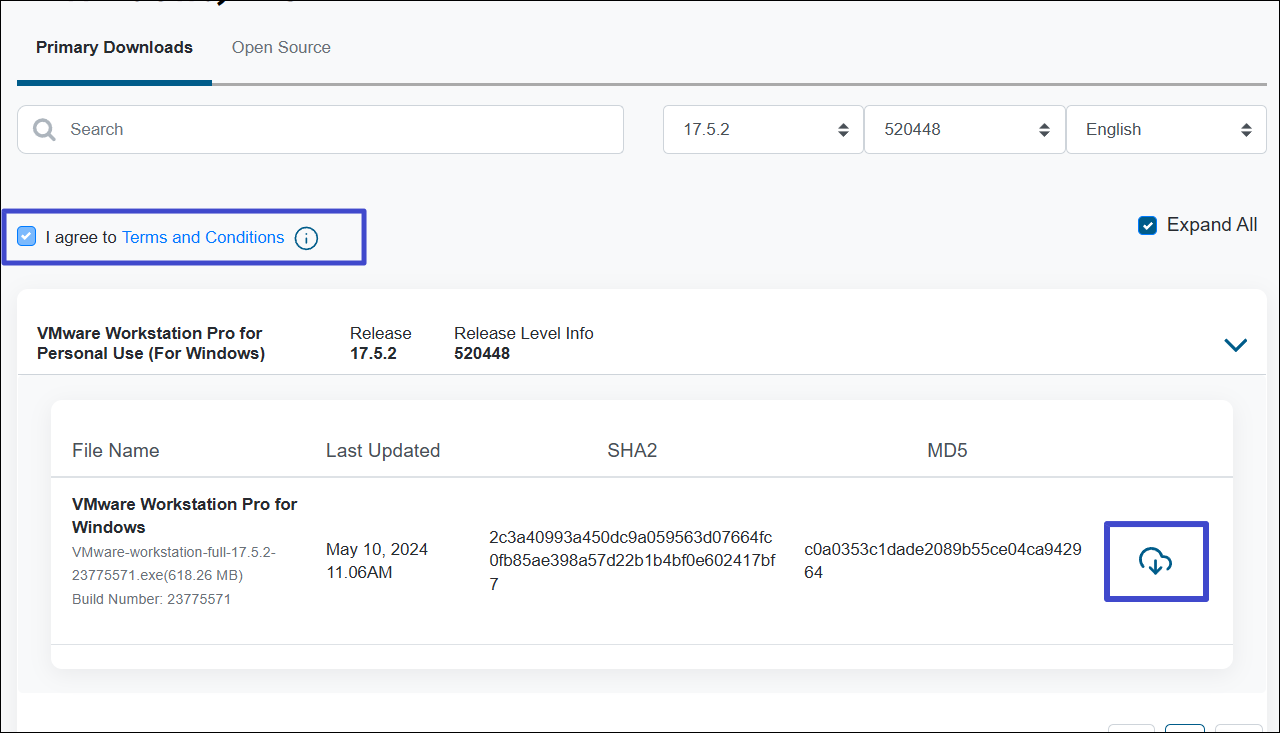 8. Klik op “VMware Workstation Pro 17.0 voor persoonlijk gebruik (Windows)' en selecteer de nieuwste beschikbare versie, zoals17.5.2.