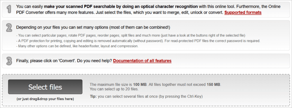 Houd er rekening mee dat er een limiet van 100 MB geldt voor gratis conversies met Online2PDF.