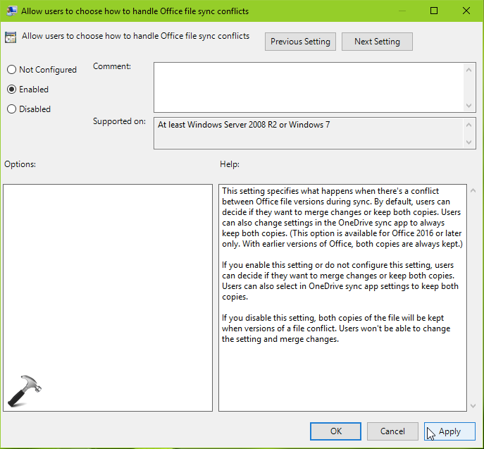 3.Dubbelklik in het rechterdeelvenster van OneDrive opSta gebruikers toe te kiezen hoe ze omgaan met Office-bestandssynchronisatieconflictenbeleidsinstelling en selecteerIngeschakeldals u clients de synchronisatie-instellingen wilt laten beheren zoals vermeld in Methode 1. U kunt ook selecterenGehandicapt, als u niet wilt dat clients de instellingen in de OneDrive-gebruikersinterface wijzigen. Klik op Toepassen gevolgd door OK.