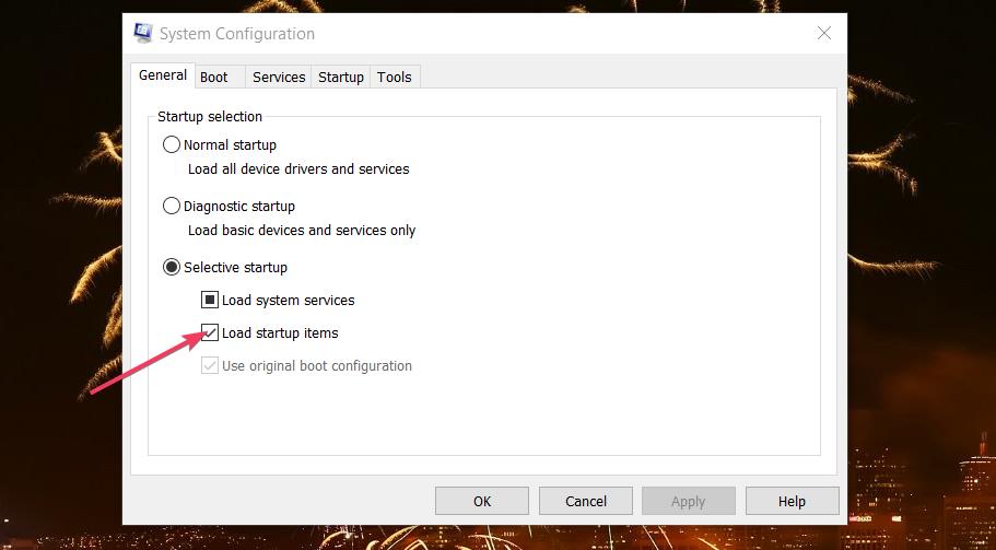Als alternatief kunt u alle opstartapp-items uitschakelen met MSConfig. Om dit te doen, klikt u op deSelectief opstartenkeuzerondje op SysteemconfiguratieAlgemeentabblad. Deselecteer vervolgens deOpstartitems ladenselectievakje in om programma's uit te schakelen die met Windows starten.