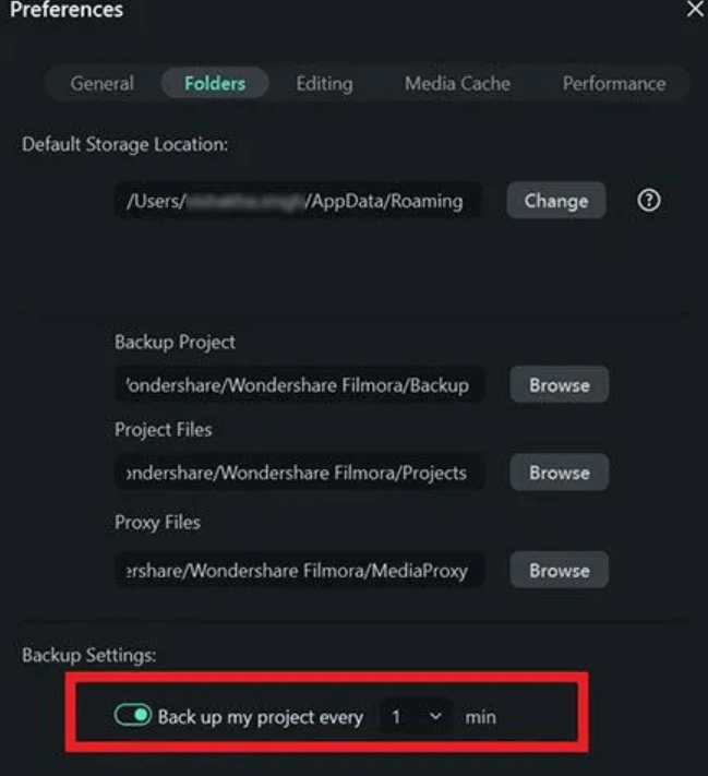 Tip van de schrijver:Om deze methode effectief te laten zijn, moet u de optie "Back-up van mijn project" in de Instellingen hebben ingeschakeld. Om deze instelling te verifiëren, volgt u deze stappen: Navigeer naar Bestanden > Voorkeuren > Map > Back-upinstellingen. Maak er een gewoonte van om regelmatig de map “Back-up” te controleren, vooral als u vaak vergeet op te slaan.