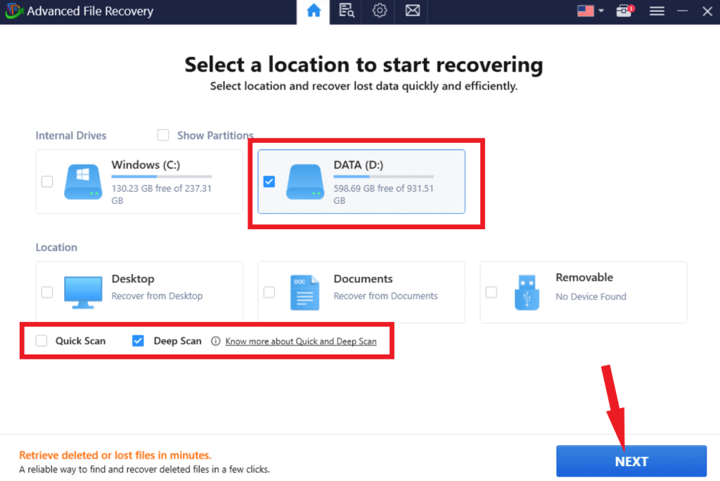 We raden u aan Diepe scan te selecteren voor een grondige zoektocht naar de verloren bestanden.